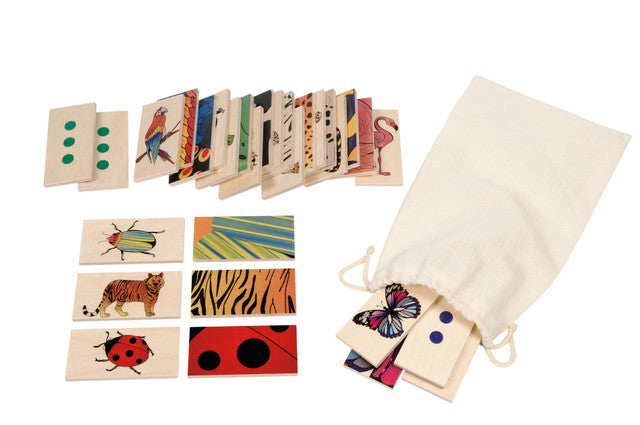 Set of 30 wooden tablets (8cm x 4cm) that make 15 pairs, each with an animal and matching pattern. Includes storage bag and instructions. 2yrs+.