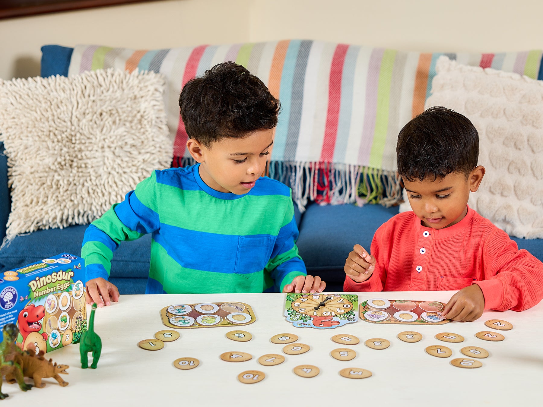 A dinosaur themed, early number recognition game. Players spin the spinner and match to a number on one of the eggs. Players aim to find the most hatched baby dinosaurs. Turn over a T-Rex wild card and the player loses an egg from their nest! Eggs can also be used to create a number line, practice counting or use the dinosaurs in a simple matching activity. Chunky wipe clean pieces, perfect for little hands to hold. The game board is made from at least 80% recycled material. 2-4 players. 3-6yrs.