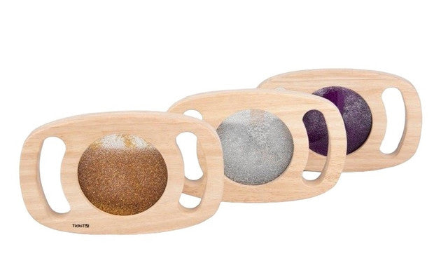 A solid rubberwood frame with easy hold handles enclosing a panel of sparkling glitter. The panel can be twisted and turned to make the glitter liquid move and flow in fascinating ways. Ideal for sensory discovery and broadening descriptive vocabulary. 18cmL x 12cmW, lens 8cmD. 1yr+.